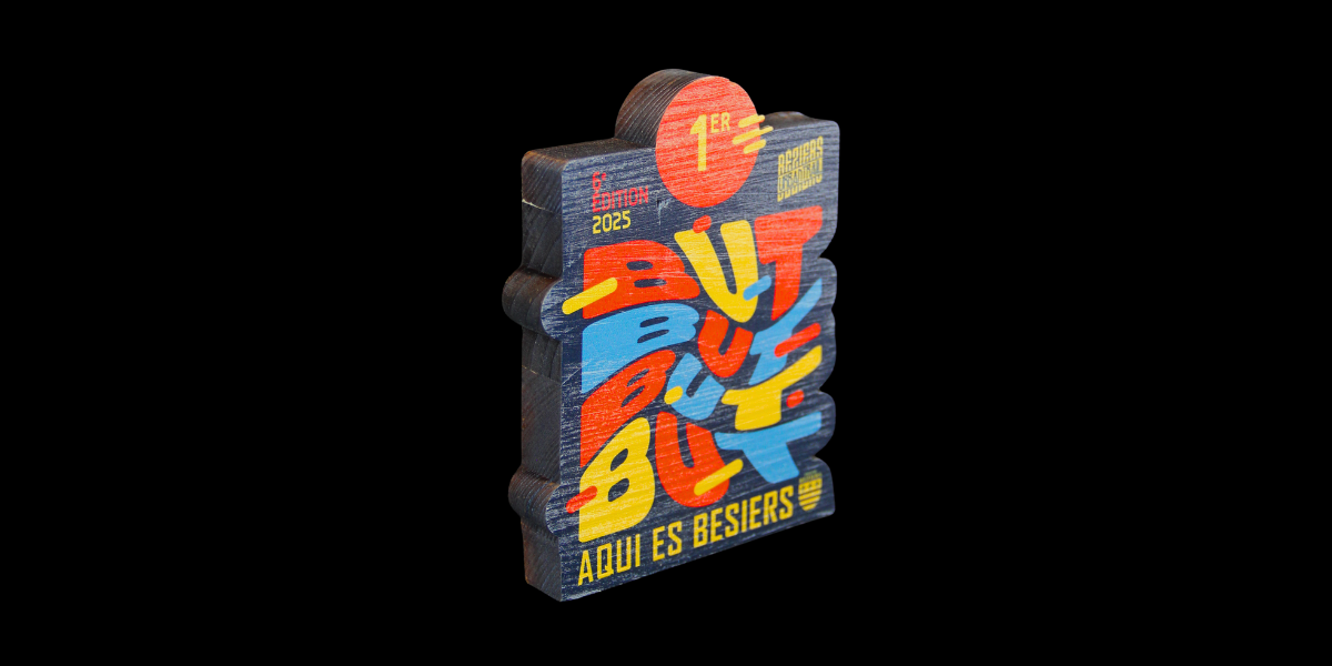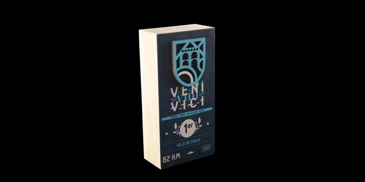 Un trophée découpé dans une pièce de bois de 2 cm d’épaisseur, personnalisé dans sa forme et son visuel grâce à la découpe laser, la gravure et des inserts.