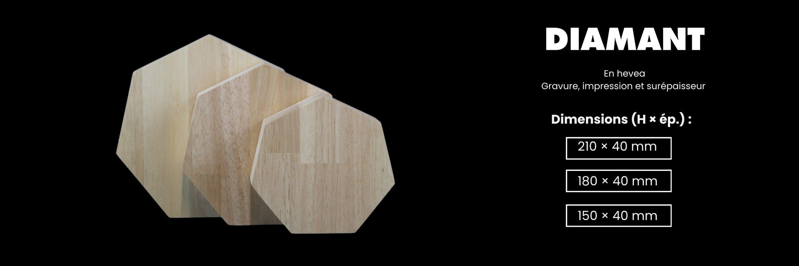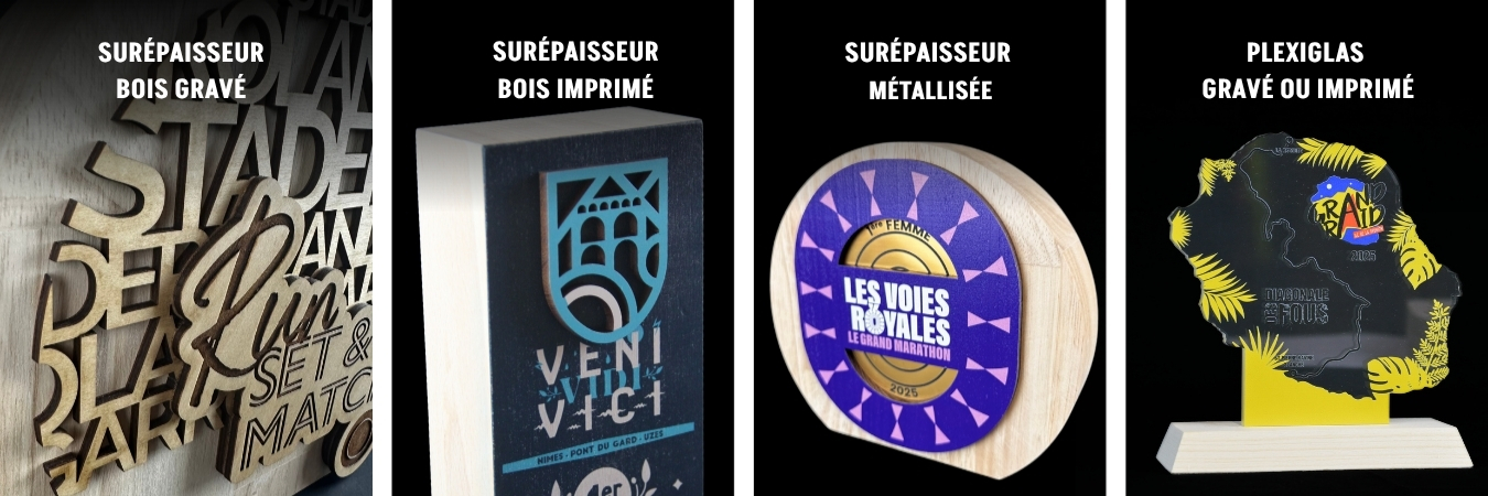 Les trophées mixtes en bois offrent une liberté totale de création, avec la possibilité d’ajouter des surépaisseurs en bois, plaquettes métallisées ou plexiglas et même de réaliser un trophée en majorité en plexiglas, chaque élément pouvant être imprimé ou gravé. C’est un véritable travail sur mesure, entièrement adaptable à vos besoins et à votre identité visuelle.