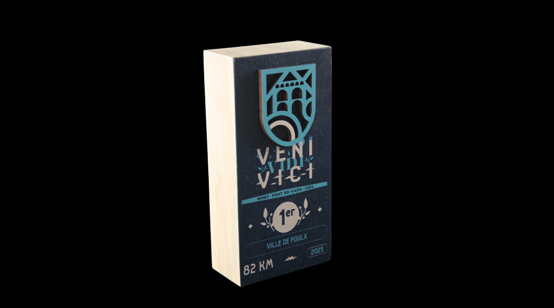 Inspirés par l’héritage romain et la richesse naturelle du Gard, les trophées de la Veni Vici mêlent élégance et authenticité. Le travail du bois, souligné par des effets de relief et de lumière grâce à l’impression UV, offre un objet de collection à la hauteur des efforts des champions. Ces récompenses incarnent la performance, le respect de la nature et la passion du trail.